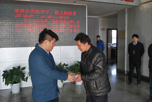[本网讯]2013年11月19日,公司工会组织为困难员工献爱心的活动。总经理顾鼎亲自将募捐到的款项交到困难职工手中,并亲切的表达了公司对他的关心,同时也带去了每一位同事对他的关爱。
