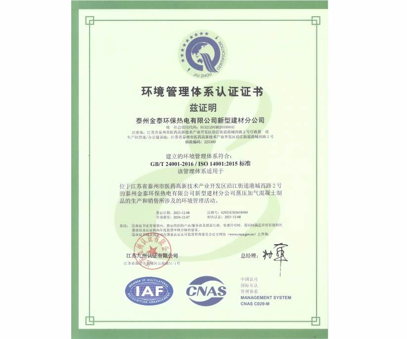 环境管理体系认证证书